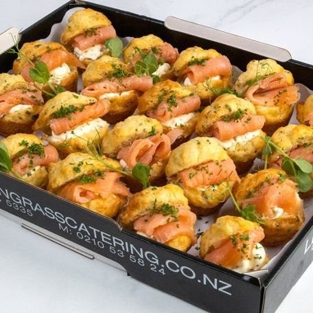 <li>Crisp cucumber round topped with citrus cream cheese & smoked salmon - GF</li>